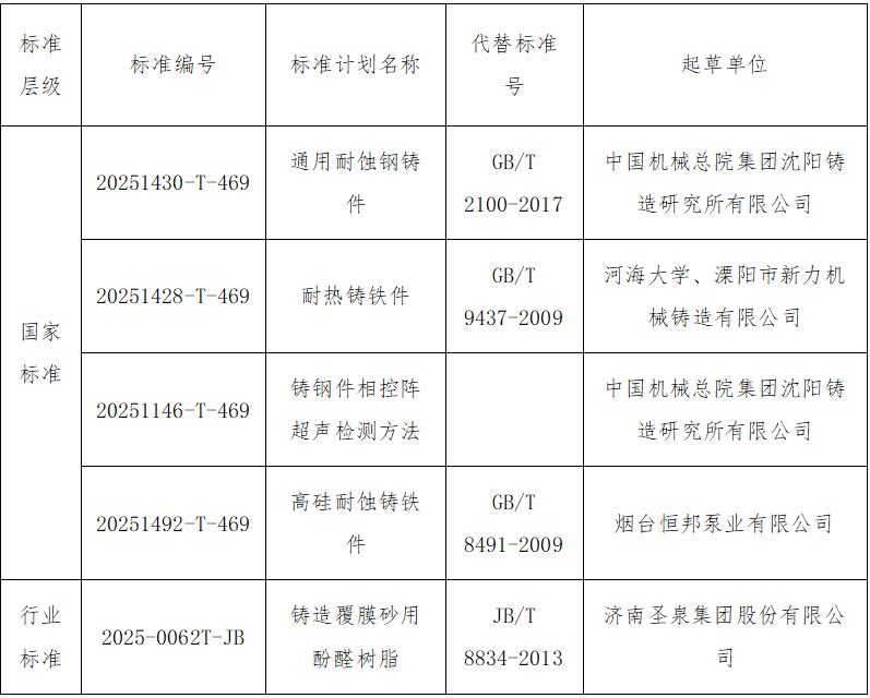 2025年3月11日,中华人民共和国工业和信息化部下达了2025年第一批行业标准制修订计划(工信厅科函〔2025〕84号)。本批行业标准制修订项目计划252项,包括标准制定164项,修订88项;重点和基础通用标准137项,其它标准115项。其中,全国铸造标准化技术委员会归口管理的修订项目1项,见下表。