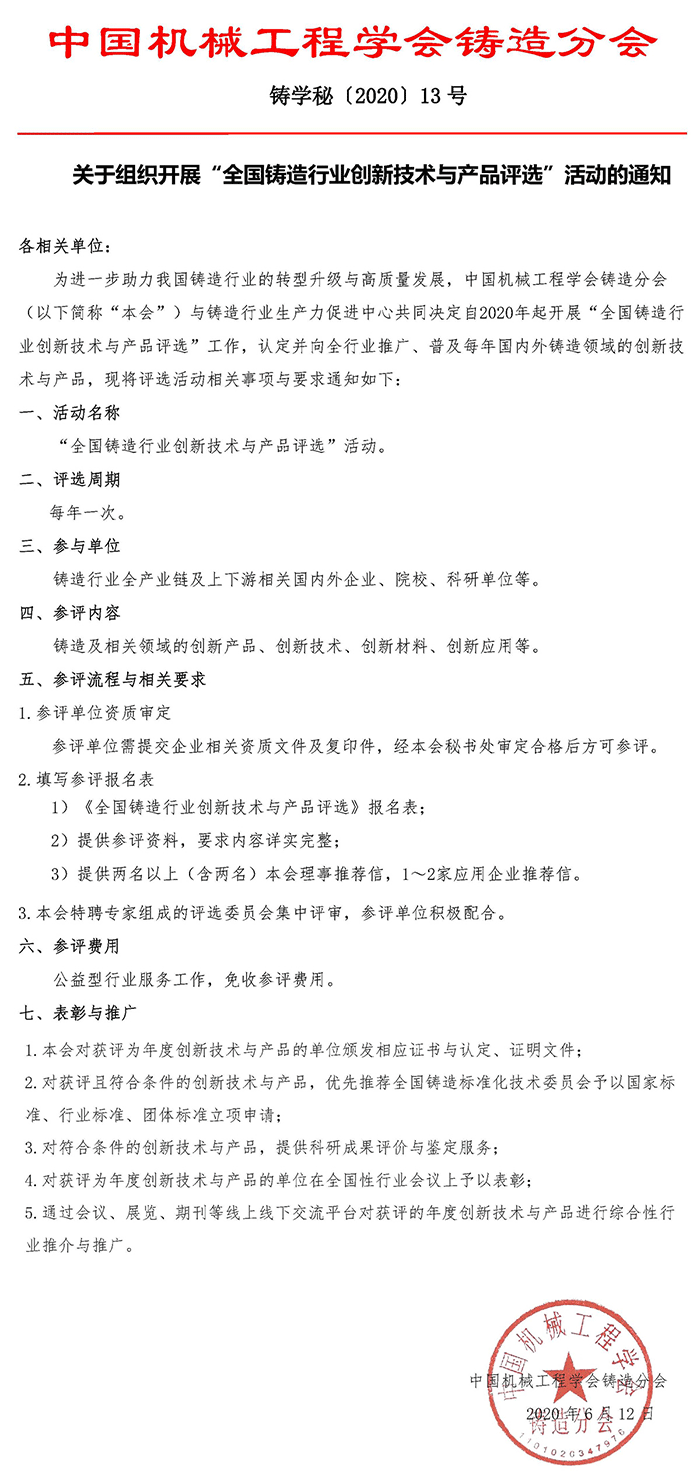 关于组织开展“全国铸造行业创新技术与产品评选”活动的通知