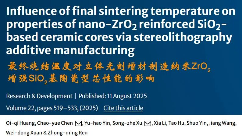 引用格式:Huang Q Q, Chen C Y, Yin Y H, et al. Influence of final sintering temperature on properties of nano-ZrO2 reinforced SiO2-based ceramic cores via stereolithography additive manufacturing. China Foundry, 2025, 22(5): 519-533. https://doi.org/10.1007/s41230-025-4182-2.