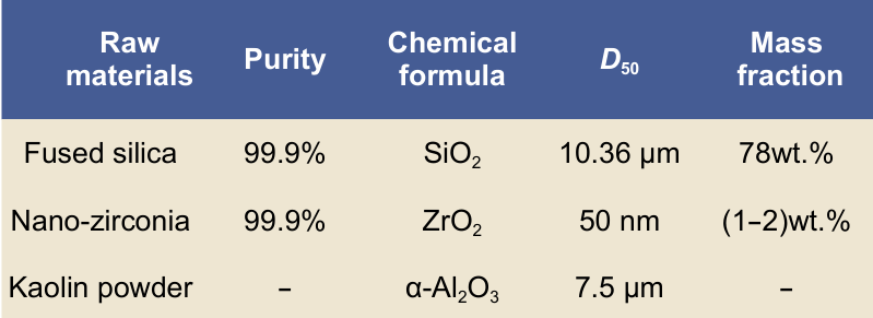 制备陶瓷坯体的原材料列于表1。有关SiO2和纳米ZrO2粉末的规格详情,请参阅我们之前的研究(Ceramics International 49(12) (2023) 20878-20889.)。本实验使用的SLA增材制造设备为CeraBuilder100Pro-SLA(武汉智能激光技术有限公司)。在SiO2粉末中添加不同含量的纳米ZrO2粉末作为矿化剂,具体含量分别为1.0wt.%、1.5wt.%和2.0wt.%。