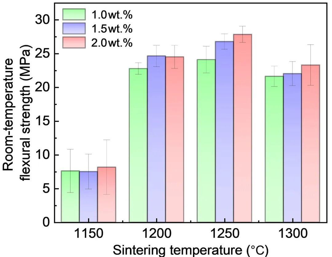 图3:不同纳米ZrO2含量的SiO2基陶瓷在不同最终烧结温度下的室温抗弯强度