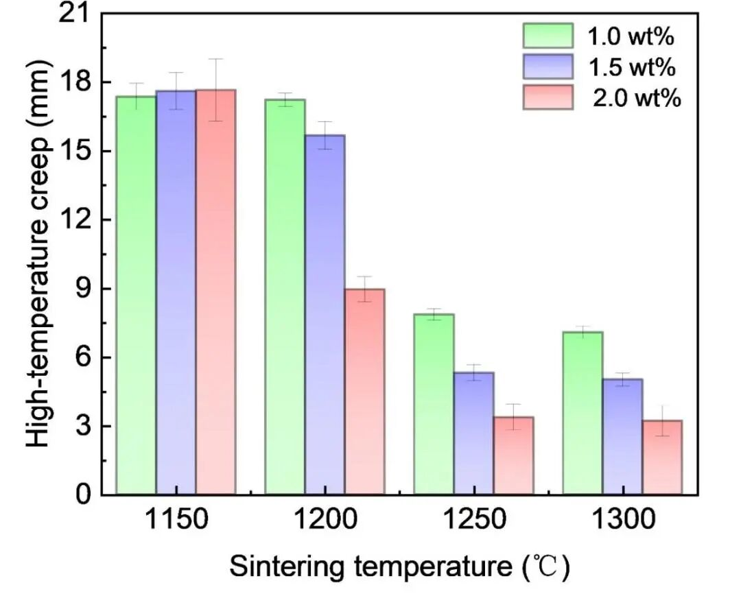 图5展示了温度变化对不同纳米ZrO含量的SiO2基陶瓷型芯的影响。基体材料由球形SiO2粉末组成。在一次烧结过程中,纳米ZrO2的助烧结作用和高温下粘性流的增强共同提高了型芯的烧结程度,导致型芯样品收缩增大、显气孔率降低、体积密度增加。此外,烧结致密化和方石英含量的增加有助于提高室温力学性能。然而,在1300 ℃烧结的样品更容易受到方石英体积收缩的影响,从而产生裂纹,从而导致室温力学性能的下降。